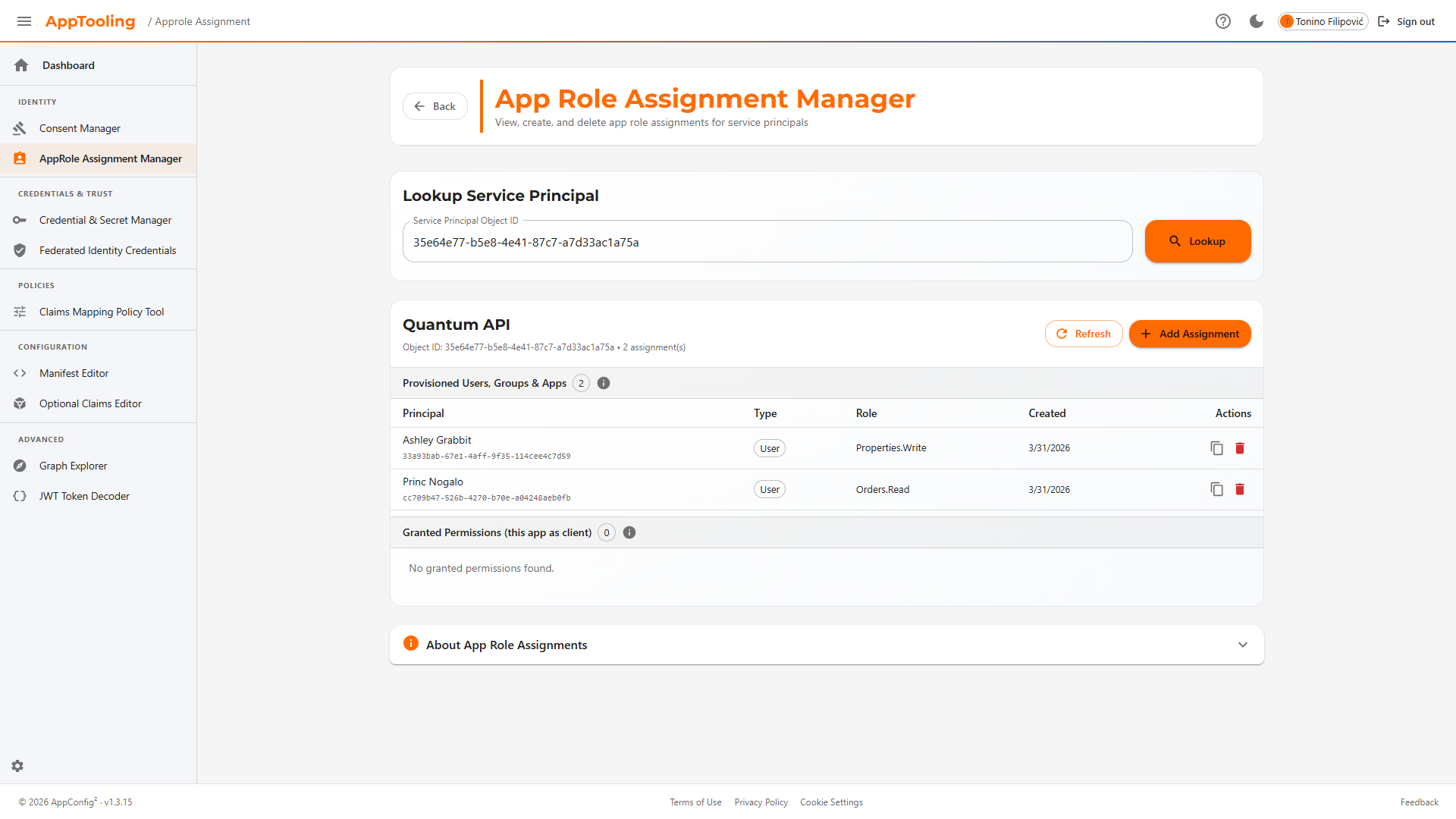 Consent cleanup, role assignments, and credential rotation — all in one interface instead of navigating across multiple Portal blades.