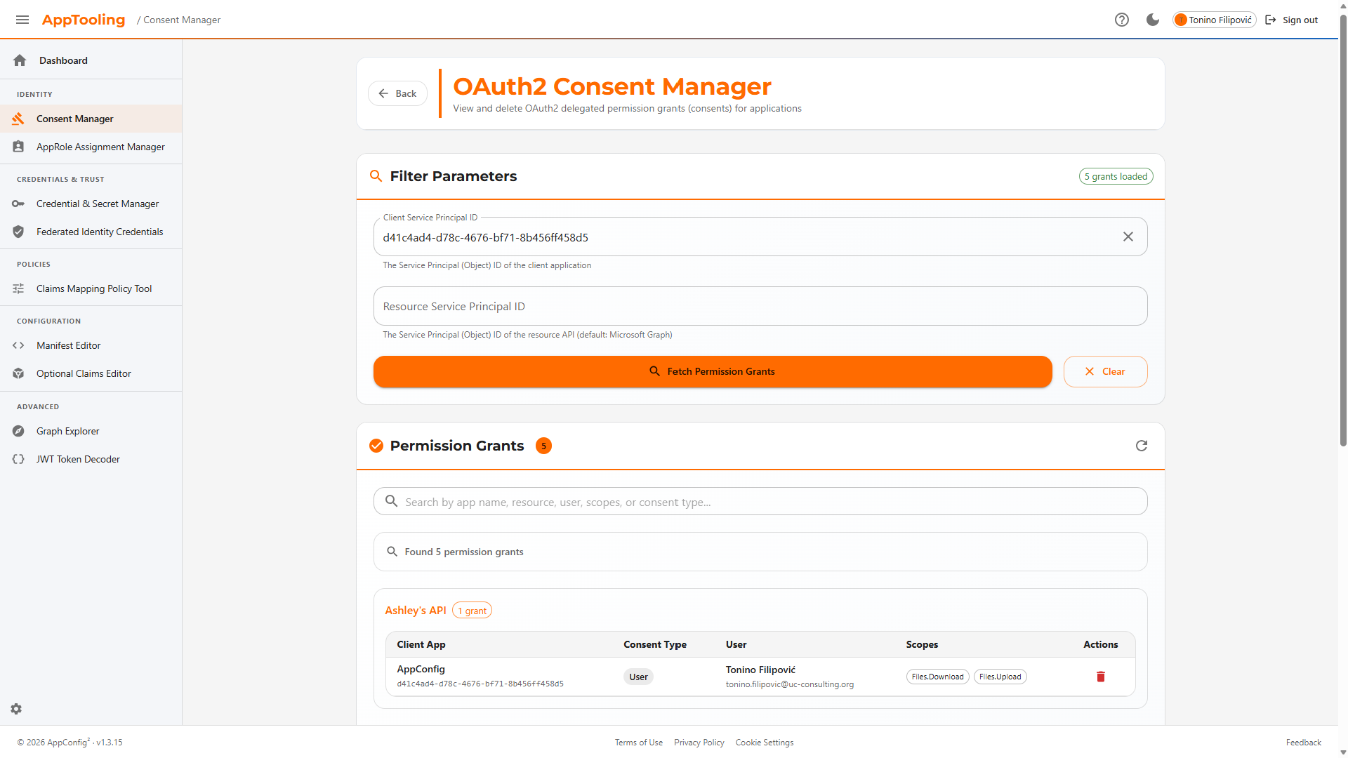 List all OAuth 2.0 delegated permission grants in the tenant. Filter by client or resource service principal. Revoke individual grants with a confirmation step. Distinguishes admin consent (AllPrincipals) from user consent (Principal) and surfaces the granting user's UPN.