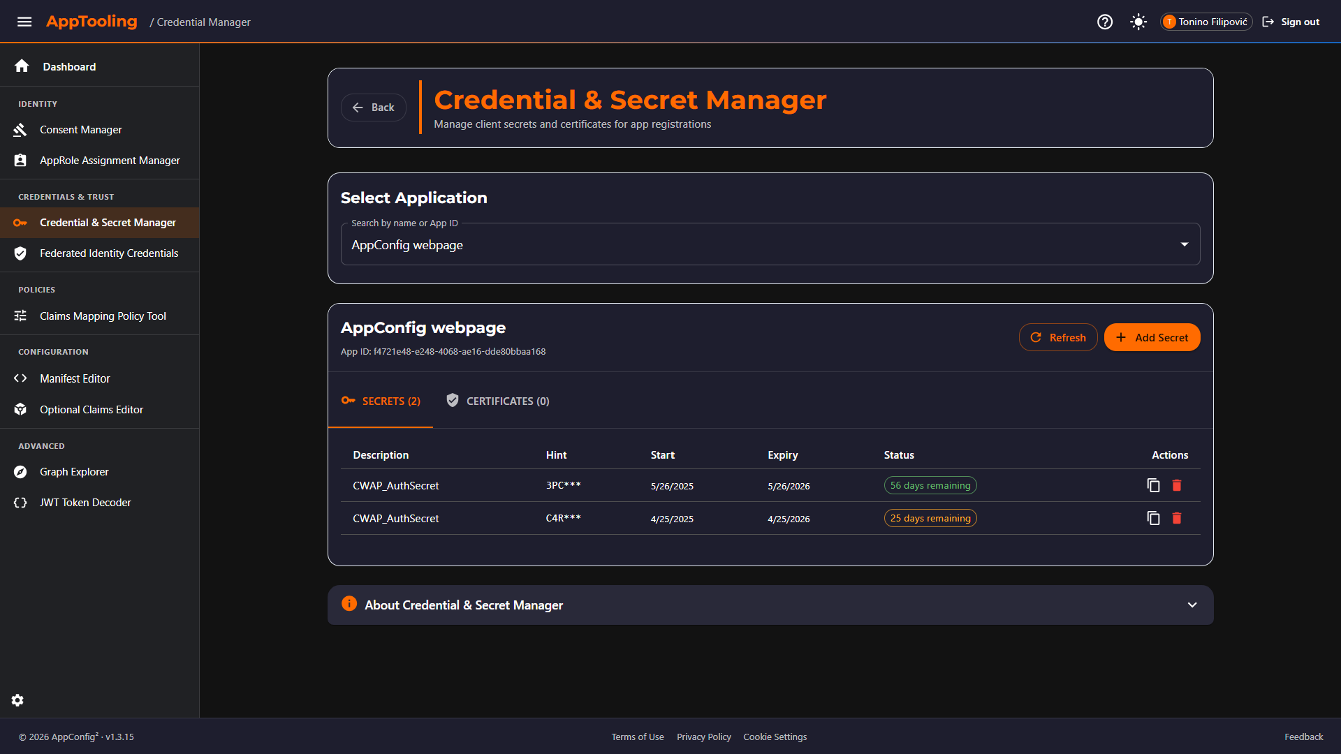 Browse client secrets and certificates across app registrations with expiry alerts. Create secrets with configurable lifetimes; values shown once only.