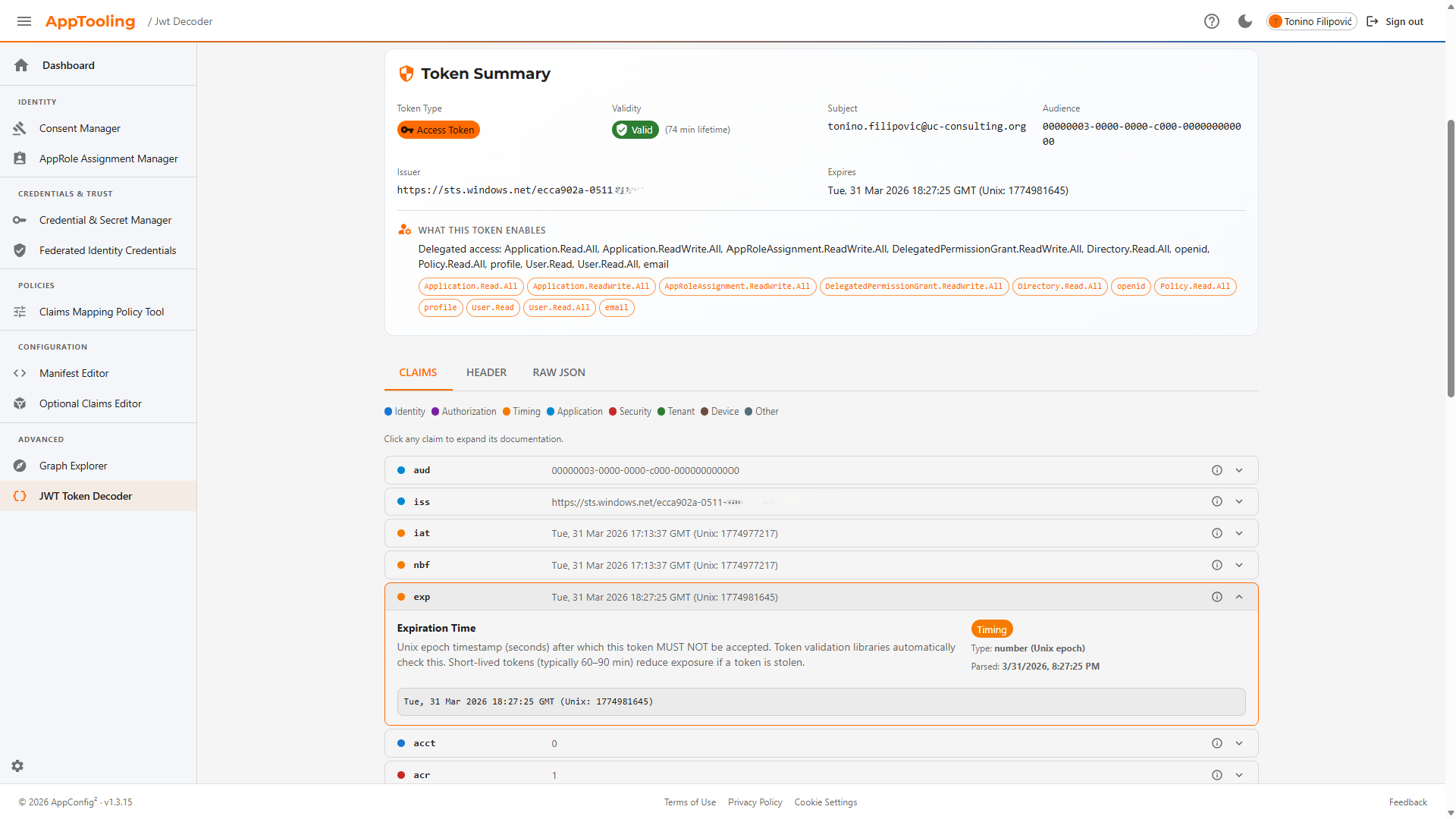 Paste any JWT (access token, ID token, or custom token) for a fully annotated breakdown. Auto-detects token type and validity (valid / expired / not-yet-valid). Token Summary shows type, expiry, subject, audience, issuer, lifetime in minutes, and a plain-English scope and app-role summary. Claims tab renders every claim with a colour-coded category dot (Identity, Authorization, Timing, Application, Security, Tenant, Device) — click any claim to expand its documentation and a Microsoft Docs link. Header and Raw JSON tabs also available. Decoding is entirely client-side; no Graph calls are made.